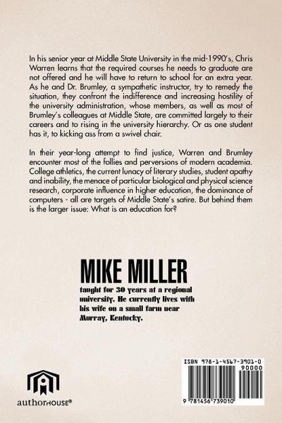 In his final year of college at Middle State University, senior Chris Warren finds that the courses he needs to graduate are not offered and he will have to return to school for an extra year. As he and Dr. Brumley, a sympathetic instructor, try to remedy the situation, they confront the indifference and increasing hostility of the university administration, whose members, as well as most of Brumley's colleagues at Middle State, are committed largely to their careers and to rising in the university hierarchy. Or as one student has it, to kicking ass from a swivel chair. In their year-long attempt to find justice, Warren and Brumley encounter most of the follies and perversions of modern academia. Collect athletics, the current lunacy of literary studies, student apathy and inability, the menace of particular biological and physical science research, corporate influence in higher education, the dominance of computers - all are targets of Middle State's satire. But behind them is the larger issue: What is an education for?