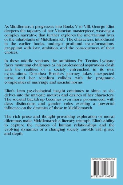 Books V to VIII of Middlemarch delve deeper into the intricate lives of the characters in the fictional town of Middlemarch, expanding on the themes of love, ambition, and societal expectations. Dr. Tertius Lydgate, with his ambitious medical endeavors, faces increasing challenges as his professional aspirations collide with the complexities of the society around him. His relationships, particularly with Rosamond Vincy, take unexpected turns, revealing the consequences of choices made in pursuit of personal and professional goals. Simultaneously, Dorothea Brooke's journey continues to unfold as she grapples with the realities of marriage and societal norms. The characters' lives become more entangled, and the repercussions of their actions reverberate through the community, shaping the dynamics of Middlemarch. George Eliot's keen psychological insight is ever-present as the narrative explores the evolving motives and desires of the characters. Themes of class distinctions, gender roles, and the impact of personal choices on the broader society come to the forefront, offering a thought-provoking commentary on the Victorian era. The rich prose and descriptive detail characterize the evolving relationships and moral dilemmas faced by the characters. As the story progresses through Books V to VIII, readers witness the characters' personal growth and the unfolding drama that arises from the intersection of their lives. By the end of this section of 'Middlemarch,' the stage is set for further twists and turns, as the characters grapple with the consequences of their decisions, and the societal backdrop continues to shape their fates. George Eliot's timeless classic maintains its narrative depth, providing a profound exploration of the human experience in the changing landscape of 19th-century England.