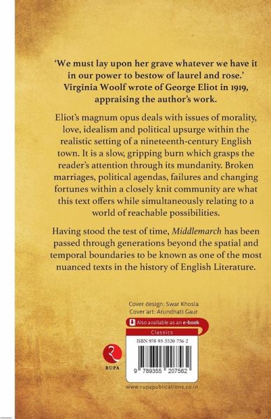 'We must lay upon her grave whatever we have it in our power to bestow of laurel and rose,' Virginia Woolf wrote of George Eliot in 1919, appraising the author's work. Eliot's magnum opus deals with issues of morality, love, idealism and political upsurge within the realistic setting of a nineteenth-century English town. It is a slow, gripping burn which grasps the reader's attention through its mundanity. Broken marriages, political agendas, failures and changing fortunes within a closely knit community are what this text offers, while simultaneously relating to a world of reachable possibilities. Having stood the test of time, Middlemarch has been passed through generations beyond the spatial and temporal boundaries to be known as one of the most nuanced texts in the history of English Literature.