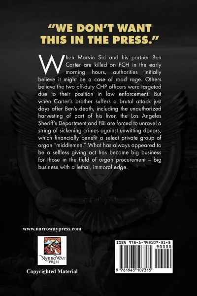 "We don’t want this in the press." Back matter: When Marvin Sid and his partner Ben Carter are killed on PCH in the early morning hours, authorities initially believe it might be a case of road rage. Others believe the two off-duty CHP officers were targeted due to their position in law enforcement. But when Carter’s brother suffers a brutal attack just days after Ben’s death, including the unauthorized harvesting of part of his liver, the Los Angeles Sheriff’s Department and FBI are forced to unravel a string of sickening crimes against unwitting donors, which financially benefit a select private group of organ "middlemen." What has always appeared to be a selfless giving act has become big business for those in the field of organ procurement – big business with a lethal, immoral edge. Inside flap: On any given day, there is an extreme shortage of available organs needed for transplantation. But where needs exist, so do criminal enterprises. Other Peoples’ Organs Procurement Association privately monitors all resources to acquire organs for high-paying clients who don’t want to linger on the UNOS list. Now, a sudden rash of killings reveals that victims as diverse as prostitutes and police officers alike are being targeted for their organs…without their consent. Sheriff Samantha Pritchard and FBI Agent John Swenson must locate the killers who supply these organizations with human body parts before yet another unsuspecting person falls victim.