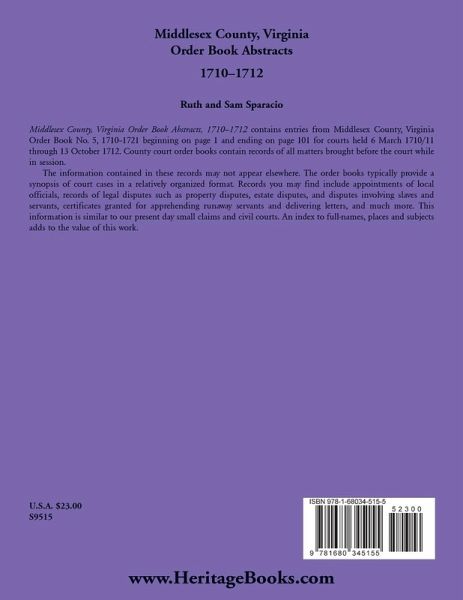 Middlesex County, Virginia Order Book Abstracts, 1710-1712 contains entries from Middlesex County, Virginia Order Book No. 5, 1710-1721 beginning on page 1 and ending on page 101 for courts held 6 March 1710/11 through 13 October 1712. County court order books contain records of all matters brought before the court while in session. The information contained in these records may not appear elsewhere. The order books typically provide a synopsis of court cases in a relatively organized format. Records you may find include appointments of local officials, records of legal disputes such as property disputes, estate disputes, and disputes involving slaves and servants, certificates granted for apprehending runaway servants and delivering letters, and much more. This information is similar to our present day small claims and civil courts. An index to full-names, places and subjects adds to the value of this work.