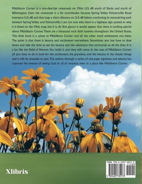 Middleton Corner is a non-descript crossroads on Ohio U.S. 68 south of Xenia and north of Wilmington. Even the crossroads is a bit unorthodox because Spring Valley Paintersville Road intersects U.S. 68 and then jogs a short distance on U.S. 68 before continuing its meandering path between Spring Valley and Paintersville. I am not sure why there is a highway sign posted or why it is listed on the Ohio map, but it is. At first glance it would appear that there is nothing special about Middleton Corner. There are a thousand such little hamlets throughout the United States. This little book is a salute to Middleton Corner and all the other small settlements out there. The point is that there is beauty and excitement everywhere. Sometimes you just have to slow down and take the time to see the beauty and the adventure that surrounds us all the time. It is a lot like the Field of Dreams. You build it and they will come. In the case of Middleton Corner all you have to do is look for the excitement, the grandeur, and the beauty in the simple things and it will be revealed to you. The author, through a series of one-page vignettes and photos has captured the essence of seeing God in all of creation, even at a place like Middleton Corner.