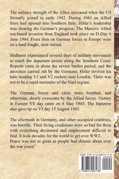 This book, Midhurst WW2 Memoirs: 4. Hard Ending (1944-1950) is the final work of a tetralogy written over a decade. Its aim is to leave an account of the life and times of a small town experiencing the development of WW2. It uses the back story of the author's time there as a story-line, adding extensive back-story accounts that few would have known of at that time. Experiences of people connected to the town's history are included showing that many famous, brave and infamous people did incredible things. The influx of evacuees from London and many Canadian, and later, US soldiers made the little town and District come alive. Book 1 deals with the history of the District before WW2 came about, this being needed as no history had been published before that linked its history into existing primary and secondary sources. Whilst some people's accounts are given over several books, they can be read as separate experience in a single book. A truth/fiction chapter explores the highly probable invasion by the Germans and what it might have been like in Midhurst. Previous Midhurst WW2 Memoirs Books are: Sydenham, Peter H., Midhurst WW2 Memoirs: The Evacuee's Story. Companion Book. Red Robin Publishing, Adelaide, 2018. Sydenham, Peter H., Midhurst WW2 Memoirs: 1. A Place Close to My Heart, Book 1. Red Robin Publishing, Adelaide, 2018. Sydenham, Peter H., Midhurst WW2 Memoirs: 2. 'Evil Rising': 'Good Awakening', Book 2. Red Robin Publishing, Adelaide, 2020. Sydenham, Peter H., Midhurst WW2 Memoirs: 3. Lowest Times (1944 -1950) Book 3. Red Robin Publishing, Adelaide, 2023 All are available as e-books and online POD hard copy