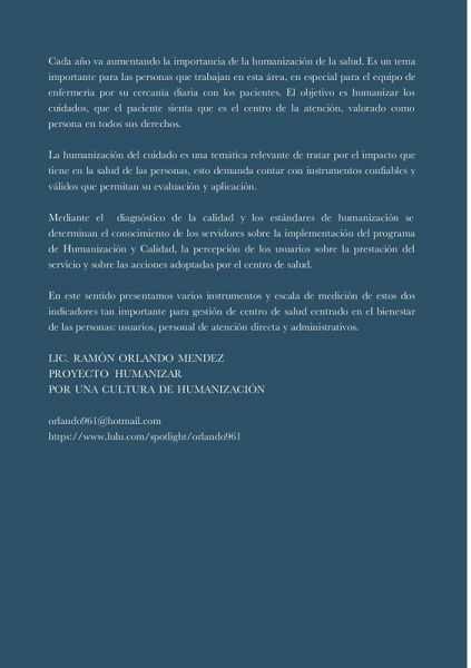 Cada año va aumentando la importancia de la humanización de la salud. Es un tema importante para las personas que trabajan en esta área, en especial para los equipo de salud por su cercanía diaria con los pacientes. El objetivo es humanizar los cuidados, que el paciente sienta que es el centro de la atención, valorado como persona en todos sus derechos. La humanización del cuidado es una temática relevante de tratar por el impacto que tiene en la salud de las personas, esto demanda contar con instrumentos confiables y válidos que permitan su evaluación y aplicación. Mediante el diagnóstico de la calidad y los estándares de humanización se determinan el conocimiento de los servidores sobre la implementación del programa de Humanización y Calidad, la percepción de los usuarios sobre la prestación del servicio y sobre las acciones adoptadas por el centro de salud. En este sentido presentamos varios instrumentos y escala de medición de estos dos indicadores tan importante para gestión de centro de salud centrado en el bienestar de las personas: usuarios, personal de atención directa y administrativos.