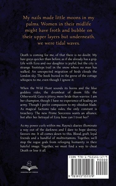 My nails made little moons in my palms. Middle-aged women might have froth and bubble on their upper layers but underneath, we were tidal waves. Death is coming for me, of that there is no doubt. My hair greys quicker than before, as if she already has a grip. Life with Ezra and our daughter is joyful, but the city is strange. Footsteps trail in the snow where no man has walked. An unexpected migration of birds clouds the London sky. The book buried in the grove of the cottage whispers to me, even though I ignore it. When the Wild Hunt sounds its horns and the blue goddess rides, the drumbeat…mehr