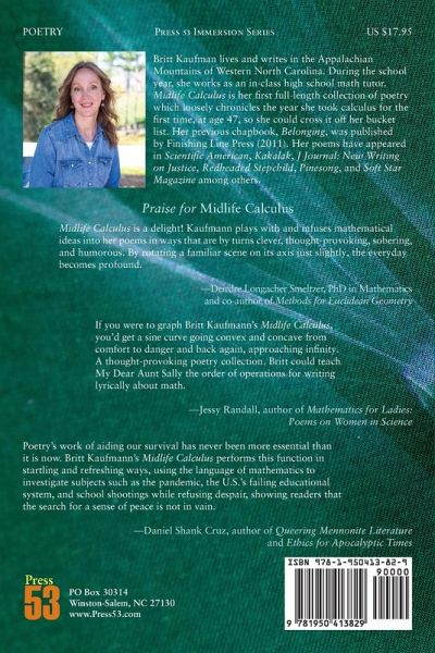 Britt Kaufman lives and writes in the Appalachian Mountains of Western North Carolina. During the school year, she works as an in-class high school math tutor. Midlife Calculus is her first full-length collection of poetry which loosely chronicles the year she took calculus for the first time, at age 47, so she could cross it off her bucket list. Her previous chapbook, belonging, was published by Finishing Line Press (2011). Her poems have appeared in Scientific American, Kakalak, J Journal: New Writing on Justice, Redheaded Stepchild, Pinesong, and Soft Star Magazine among others.
