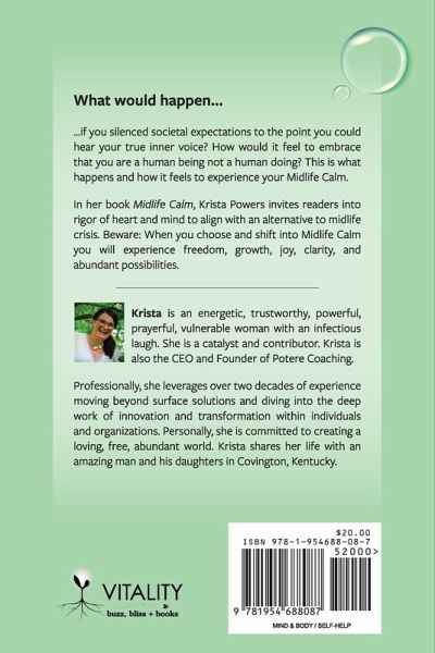 What would happen if you silenced societal expectations to the point you could hear your true inner voice? How would it feel to embrace that you are a human being not a human doing? This is what happens and how it feels to experience your Midlife Calm. In her book Midlife Calm, Krista Powers invites readers into rigor of heart and mind to align with an alternative to midlife crisis. Beware: When you choose and shift into Midlife Calm you will experience freedom, growth, joy, clarity, and abundant possibilities.