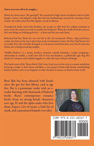 You're never too old to be naughty... Maisie has always been "the good girl". She married her high school sweetheart, had two kids, bought a house, and adopted a dog. But when her husband gets arrested for running a Ponzi scheme, she realizes that their life together was all an illusion. Unemployed, broke, and newly homeless, she accepts an offer from her college roommate to move across the country to work at a small-town bookstore. When she smells the fresh ocean air, she's sure things are looking up for her -- at least until she rear-ends Santa... Reformed bad boy Thom has one vice left in life: his motorcycle. When a big-eyed beauty crashes into him on his way to play Santa at the Community Center, the Fire Chief knows he's in trouble. Not only is his bike damaged, so is his peace of mind, because every time he runs into Maisie, she is doing something naughty. "Midlife Madness" is a steamy instalove romantic comedy featuring a couple navigating a relationship in midlife, a small town full of nosy matchmakers, a pathetically ugly dog who thinks he's a human, and a holiday happily ever after that none of them will forget. This book is part of the "Boozy Book Club" series. Each story in the series is a steamy standalone featuring a couple in their forties and fifties, a nosy group of book club friends, matchmaking family members, and a sweet happily ever after that proves anyone can find love later in life.