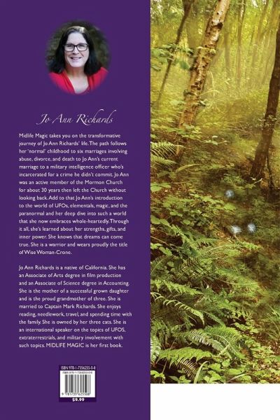 Midlife Magic takes you on the transformative journey of Jo Ann Richards' life, from her typical suburban childhood, through six marriages involving abuse, divorce, and death, to her current marriage to a military intelligence officer incarcerated for a crime he didn't commit. Jo Ann had been an active member of the Mormon Church for nearly 30 years before leaving it behind to fully embrace the world of UFOs, elementals, magic and the paranormal which had long spoken to her soul. Through her many struggles, she found her strengths, gifts, and inner power, and learned that dreams can, and do, come true. Today she is a warrior who proudly carries the title, Wise Woman-Crone.