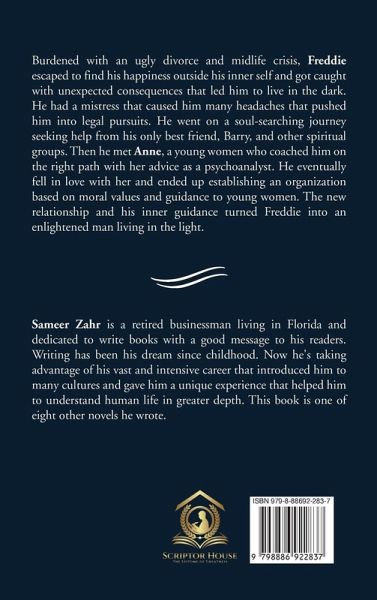 Burdened with an ugly divorce and midlife crisis, Freddie escaped to find his happiness outside his inner self and got caught with unexpected consequences that led him to live in the dark. He had a mistress that caused him many headaches that pushed him into legal pursuits. He went on a soul-searching journey seeking help from his only best friend, Barry, and other spiritual groups. Then he met Anne, a young women who coached him on the right path with her advice as a psychoanalyst. He eventually fell in love with her and ended up establishing an organization based on moral values and guidance to young women. The new relationship and his inner guidance turned Freddie into an enlightened man living in the light.