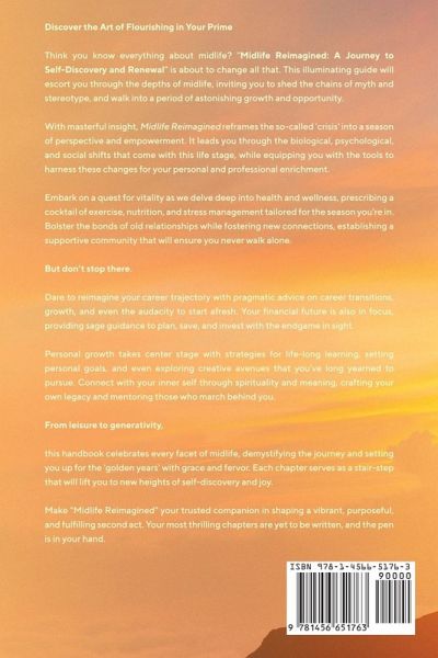 Discover the Art of Flourishing in Your Prime Think you know everything about midlife? "Midlife Reimagined: A Journey to Self-Discovery and Renewal" is about to change all that. This illuminating guide will escort you through the depths of midlife, inviting you to shed the chains of myth and stereotype, and walk into a period of astonishing growth and opportunity. With masterful insight, Midlife Reimagined reframes the so-called 'crisis' into a season of perspective and empowerment. It leads you through the biological, psychological, and social shifts that come with this life stage, while equipping you with the tools to harness these changes for your personal and professional enrichment. Embark on a quest for vitality as we delve deep into health and wellness, prescribing a cocktail of exercise, nutrition, and stress management tailored for the season you're in. Bolster the bonds of old relationships while fostering new connections, establishing a supportive community that will ensure you never walk alone. But don't stop there. Dare to reimagine your career trajectory with pragmatic advice on career transitions, growth, and even the audacity to start afresh. Your financial future is also in focus, providing sage guidance to plan, save, and invest with the endgame in sight. Personal growth takes center stage with strategies for life-long learning, setting personal goals, and even exploring creative avenues that you've long yearned to pursue. Connect with your inner self through spirituality and meaning, crafting your own legacy and mentoring those who march behind you. From leisure to generativity, this handbook celebrates every facet of midlife, demystifying the journey and setting you up for the 'golden years' with grace and fervor. Each chapter serves as a stair-step that will lift you to new heights of self-discovery and joy. Make "Midlife Reimagined" your trusted companion in shaping a vibrant, purposeful, and fulfilling second act. Your most thrilling chapters are yet to be written, and the pen is in your hand.