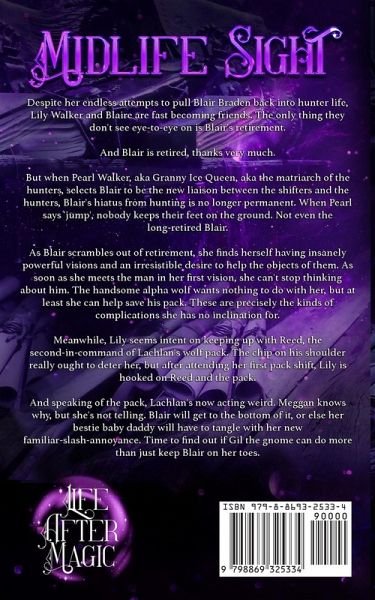 Despite her endless attempts to pull Blair Braden back into hunter life, Lily Walker and Blair are fast becoming friends. The only thing they don't see eye-to-eye on is Blair's retirement. And Blair is retired, thanks very much. But when Pearl Walker, aka Granny Ice Queen, aka the matriarch of the hunters, selects Blair to be the new liaison between the shifters and the hunters, Blair's hiatus from hunting is no longer permanent. When Pearl says 'jump', nobody keeps their feet on the ground. Not even the long-retired Blair. As Blair scrambles out of retirement, she finds herself having insanely powerful visions and an irresistible desire to help the objects of them. As soon as she meets the man in her first vision, she can't stop thinking about him. The handsome alpha wolf wants nothing to do with her, but at least she can help save his pack. These are precisely the kinds of complications she has no inclination for. Meanwhile, Lily seems intent on keeping up with Reed, the second-in-command of Lachlan's wolf pack. The chip on his shoulder really ought to deter her, but after attending her first pack shift, Lily is hooked on Reed and the pack. And speaking of the pack, Lachlan's now acting weird. Meggan knows why, but she's not telling. Blair will get to the bottom of it, or else her bestie baby daddy will have to tangle with her new familiar-slash-annoyance. Time to find out if Gil the gnome can do more than just keep Blair on her toes. The Hunting After Forty series is part of the Life After Magic World.