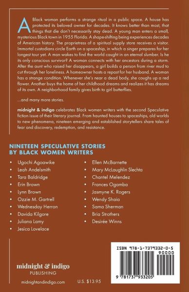 A Black woman performs a strange ritual in a public space. A house has protected its beloved owner for decades. It knows better than most, that things that die don't necessarily stay dead. A young man enters a small, mysterious Black town in 1955 Florida. A shape-shifting being experiences decades of American history. The proprietress of a spiritual supply store receives a visitor. Immortal custodians circle Earth on a spaceship, in which a singer prepares for her longest tour yet. A man wakes to find the world caught in an eternal slumber. Is he its only conscious survivor? A woman connects with her ancestors during a storm. After the aunt who raised her disappears, a girl builds a person from river mud to cut through her loneliness. A homeowner hosts a repast for her husband. A woman has a strange condition-whenever she's near a dead body, she coughs up a red flower. Another buys the home of her childhood dreams and realizes it has dreams of its own. A neighborhood family gives birth to girl butterflies. ...and many more stories. midnight & indigo celebrates Black women writers with the second Speculative fiction issue of their literary journal. From haunted houses to spaceships, old worlds to new phenomena, nineteen emerging and established Black storytellers share tales of fear and discovery, redemption, and resistance. Contributors include: Ugochi Agoawike, Leah Andelsmith, Tara Baldridge, Erin Brown, Lynn Brown, Ozzie M. Gartrell, Wednesday Herron, Davida Kilgore, Juliana Lamy, Jesica Lovelace, Ellen McBarnette, Mary McLaughlin Slechta, Chantel Melendez, Frances Ogamba, Jasmyne K. Rogers, Wendy Shaia, Sama Sherman, Bria Strothers, and Desirée Winns.