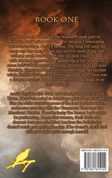 Welcome to Portswain, the Southern most port of Tembia! Don't mind our dust. No, we aren't renovating, we're under siege. Oh, it'll be fine. The king will send the army any day now, and we can survive most of the year without much hardship. If only we didn't have to deal with random monsters just appearing in our streets, or some half-witted sorcerer stealing children from the poor districts. There are rumors of a hooded mage, an ancient witch. Hells, scholars have even suggested there once was a dragon nearby! But not to worry, it's long dead, or so the sages say. Avoid Bayside after dark, and mind your purse in Tent Town. If you've a mind to drinking a pint of some mighty fine ale while watching some of the best bards in town, make sure you stop into the Cinnamon Tree near the Merchant District. If you're lucky the Romer Lark might be performing. Damn fine woman, that! Hells of a dancer! Just you mind that Landros the Pathfinder doesn't catch you getting handsy. If he doesn't, she'll deal with you right quick enough herself.