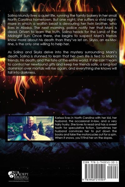 Solina Mundy lives a quiet life, running the family bakery in her small North Carolina hometown. But one night, she suffers a vivid nightmare in which a wolfish beast is devouring her twin brother, who lives in Alaska. The next morning, police notify her that Mani is dead. Driven to learn the truth, Solina heads for the Land of the Midnight Sun. Once there, she begins to suspect Mani's friends know more about his death than they've let on. Skyla, an ex-Marine, is the only one willing to help her. As Solina and Skyla delve into the mystery surrounding Mani's death, Solina is stunned to learn that her own life is tied to Mani's friends, his death, and the fate of the entire world. If she can't learn to control her newfound gifts and keep her friends safe, a long-lost dominion over mortals will rise again, and everything she knows will fall into darkness.