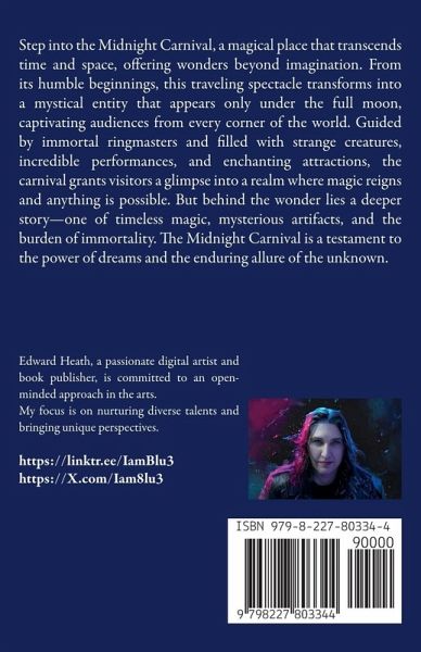 Step into the Midnight Carnival, a magical place that transcends time and space, offering wonders beyond imagination. From its humble beginnings, this traveling spectacle transforms into a mystical entity that appears only under the full moon, captivating audiences from every corner of the world. Guided by immortal ringmasters and filled with strange creatures, incredible performances, and enchanting attractions, the carnival grants visitors a glimpse into a realm where magic reigns and anything is possible. But behind the wonder lies a deeper story-one of timeless magic, mysterious artifacts, and the burden of immortality. The Midnight Carnival is a testament to the power of dreams and the enduring allure of the unknown.