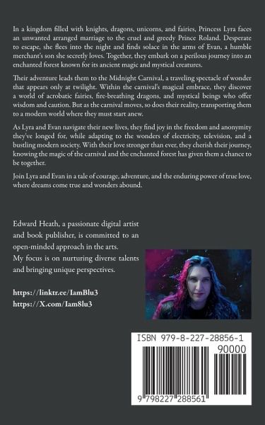 In a kingdom filled with knights, dragons, unicorns, and fairies, Princess Lyra faces an unwanted arranged marriage to the cruel and greedy Prince Roland. Desperate to escape, she flees into the night and finds solace in the arms of Evan, a humble merchant's son she secretly loves. Together, they embark on a perilous journey into an enchanted forest known for its ancient magic and mystical creatures. Their adventure leads them to the Midnight Carnival, a traveling spectacle of wonder that appears only at twilight. Within the carnival's magical embrace, they discover a world of acrobatic fairies, fire-breathing dragons, and mystical beings who offer wisdom and caution. But as the carnival moves, so does their reality, transporting them to a modern world where they must start anew. As Lyra and Evan navigate their new lives, they find joy in the freedom and anonymity they've longed for, while adapting to the wonders of electricity, television, and a bustling modern society. With their love stronger than ever, they cherish their journey, knowing the magic of the carnival and the enchanted forest has given them a chance to be together. Join Lyra and Evan in a tale of courage, adventure, and the enduring power of true love, where dreams come true and wonders abound.