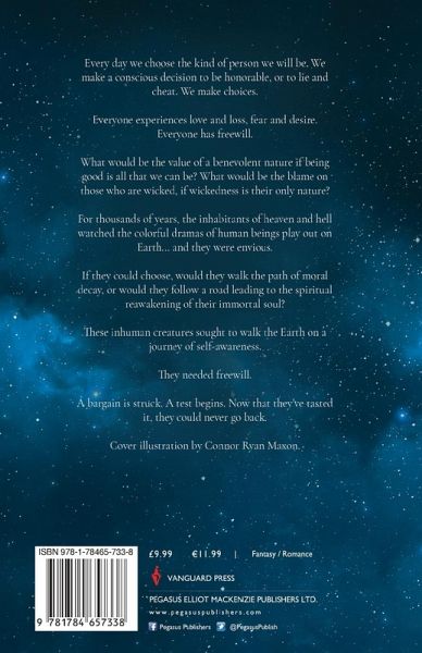 Every day we choose the kind of person we will be. We make a conscious decision to be honorable, or to lie and cheat. We make choices. Everyone experiences love and loss, fear and desire. Everyone has freewill. What would be the value of a benevolent nature if being good is all that we can be? What would be the blame on those who are wicked, if wickedness is their only nature? For thousands of years, the inhabitants of heaven and hell watched the colorful dramas of human beings play out on Earth... and they were envious. If they could choose, would they walk the path of moral decay, or would they follow a road leading the spiritual reawakening of their immortal soul? These inhuman creatures sought to walk the Earth on a journey of self-awareness. They needed freewill. A bargain is struck. A test begins. Now that they've tasted it, they could never go back. Cover illustration by Connor Ryan Maxon.