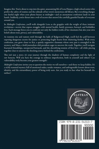 Imagine this: You're about to step into the quiet, unassuming life of Lena Harper, a high school senior who prefers the safety of routine and the solitude of her town's mysterious old library. But everything changes one fateful night when your phone buzzes at midnight-and an anonymous confession lands in your hands. Suddenly, you're thrust into a web of secrets that unravel the carefully guarded facades of everyone around you. In Midnight Confessions, you'll walk alongside Lena as she grapples with the weight of these intimate revelations-secrets that expose struggles with mental health, family pressures, betrayal, and forbidden love. Each message forces you to confront not only the hidden truths of her classmates but also your own beliefs about trust, privacy, and vulnerability. As tensions rise and rumors swirl through the halls of Ridgewood High, you'll feel the pull between exposing dangerous secrets for justice or protecting fragile hearts from shattering further. With every confession, you grow closer to Kai, a quietly supportive classmate whose own past is entangled in the mystery, and Maya, a bold journalism club president eager to uncover the truth. Together, you'll navigate fractured friendships, unexpected betrayals, and the electrifying tension of first love-all while piecing together clues to uncover the shocking source behind the confessions. This isn't just a story; it's your journey through the shadows of human complexity and the light of raw honesty. Will you have the courage to embrace imperfection, both in yourself and others? Can vulnerability truly become your greatest strength? Midnight Confessions invites you to question the stories we tell ourselves-and those we keep hidden. It's a richly textured mystery full of emotional stakes, tender romance, and unforgettable lessons about trust, identity, and the extraordinary power of being truly seen. Are you ready to face what lies beneath the surface?