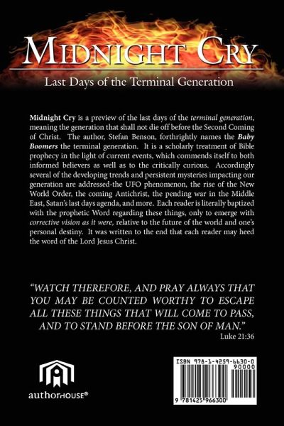 Midnight Cry is a close look through the eyeball of Scripture at the fifth through the twentieth chapters of the Book of Revelation. A look that fostered a scenario regarding our Day that was brought into focus by the prophecies of Daniel, Ezekiel, and the Lord Jesus in the Old Testament and the Apostles Paul and John in the New Testament. This book is my written testimony of what I saw when I superimposed these biblical texts over our present world society. For I saw answers to the developing trends and the persistent mysteries impacting our generation-the UFO phenomenon, the rise of the New World Order, the coming Antichrist, the pending war in the Middle East, Satan's last day agenda, and some of the less heralded but equally compelling end-time signs. What God gave me to understand with the insight of some of the most gifted Bible prophecy teachers of our generation, initially shocked and amazed me. Nevertheless as an evangelical theologian I was challenged to publish a provocative yet plausible message, a message that is not publicly endorsed by a majority of the conservative theological society with whom I share a deep affinity. Midnight Cry therefore is offered according to the spirit of faith; I believed therefore I have written. As an evangelist I am constrained to cry loud and spare not, because I am indebted to every man living in the terminal generation to deliver this message to you for your most sober reflection. I strongly recommend that each one read this book slowly and during a quiet time. Also, refer to the Bible frequently to see if the things that are written in this book are in line with the Word of God. Midnight Cry may well prove to be one of the most important books that you will ever read. "AND AT MIDNIGHT A CRY WAS HEARD: 'BEHOLD, THE BRIDEGROOM IS COMING; GO OUT TO MEET HIM." (Matthew 25:6)