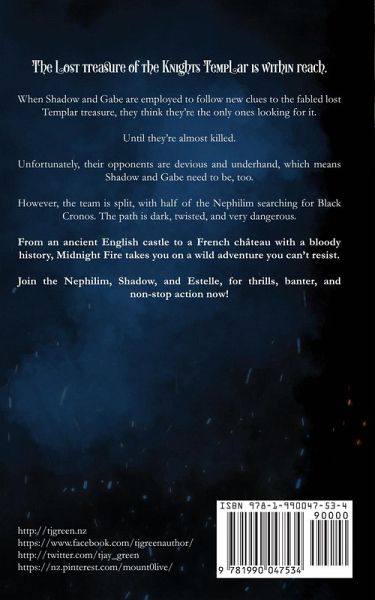 The lost treasure of the Knights Templar is within reach. When Shadow and Gabe are employed to follow new clues to the fabled lost Templar treasure, they think they're the only ones looking for it. Until they're almost killed. Unfortunately, their opponents are devious and underhand, which means Shadow and Gabe need to be, too. However, the team is split, with half of the Nephilim searching for Black Cronos. The path is dark, twisted, and very dangerous. From an ancient English castle to a French château with a bloody history, Midnight Fire takes you on a wild adventure you can't resist. Join the Nephilim, Shadow, and Estelle, for thrills, banter, and non-stop action now!