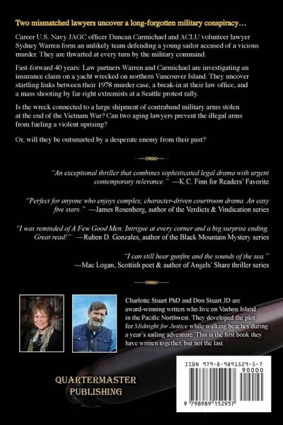 Two mismatched lawyers uncover a long-forgotten military conspiracy... Career U.S. Navy JAGC officer Lt. Duncan Carmichael and an ACLU volunteer lawyer, Sydney Warren, form an unlikely team defending a young uncooperative sailor accused of a vicious murder on a U.S. Navy base but are thwarted at every turn by the military command. Fast-forward 40 years: Warren and Carmichael are investigating an insurance claim on a yacht wrecked on northern Vancouver Island when they uncover startling links between their 1978 murder case, a break-in at their law office, and a mass shooting by far-right extremists at a protest rally. Can they prove that the wreck is connected to a large shipment of contraband military arms stolen at the end of the Vietnam War? Can two aging lawyers prevent the illegal arms from fueling a violent uprising or will they be outsmarted by a desperate enemy from their past?