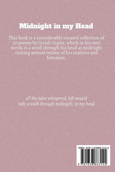 This book is a collection of 50 poems dating back to 2018 and as recent as when the manuscript had 46 poems and the author decided it needed 4 more. The poems, however are arranged in no specific order and do not relate to a specific theme. This book contains poems that have been derived from different stories the author has either exprienced, or created in his head. There are a lot of realities in this book, and many more fantasies. The title "Midnight in my Head" is author’s aim to describe the anxiety and before bed thoughts that occur with the author as the major part of contained poems have been written during the vulnerability darkness of the night welcomes and during that time,his head like many others is filled with stories that must be penned down. This book is his journey to some of these thoughts, as he hopes that several of these resonate with your midnight thoughts too. Else, a stroll through his head should be a fair pastime.