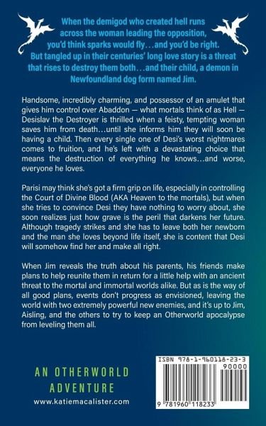 When the demigod who created hell runs across the woman leading the opposition, you'd think sparks would fly...and you'd be right. But tangled up in their centuries' long love story is a threat that rises to destroy them both...and their child, a demon in Newfoundland dog form named Jim. Handsome, incredibly charming, and possessor of an amulet that gives him control over Abaddon - what mortals think of as Hell - Desislav the Destroyer is thrilled when a feisty, tempting woman saves him from death...until she informs him they will soon be having a child. Then every single one of Desi's worst nightmares comes to fruition, and he's left with a devastating choice that means the destruction of everything he knows...and worse, everyone he loves. Parisi may think she's got a firm grip on life, especially in controlling the Court of Divine Blood (AKA Heaven to the mortals), but when she tries to convince Desi they have nothing to worry about, she soon realizes just how grave is the peril that darkens her future. Although tragedy strikes and she has to leave both her newborn and the man she loves beyond life itself, she is content that Desi will somehow find her and make all right. When Jim reveals the truth about his parents, his friends make plans to help reunite them in return for a little help with an ancient threat to the mortal and immortal worlds alike. But as is the way of all good plans, events don't progress as envisioned, leaving the world with two extremely powerful new enemies, and it's up to Jim, Aisling, and the others to try to keep an Otherworld apocalypse from leveling them all.