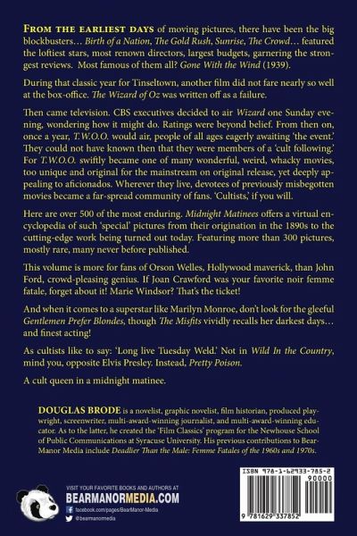 From the earliest days of moving pictures, there have been the big blockbusters... Birth of a Nation, The Gold Rush, Sunrise, The Crowd... featured the loftiest stars, most renown directors, largest budgets, garnering the strongest reviews. Most famous of them all? Gone With the Wind (1939). During that classic year for Tinseltown, another film did not fare nearly so well at the box-office. The Wizard of Oz was written off as a failure. Then came television. CBS executives decided to air Wizard one Sunday evening, wondering how it might do. Ratings were beyond belief. From then on, once a year, T.W.O.O. would air, people of all ages eagerly awaiting 'the event.' They could not have known then that they were members of a 'cult following.' For T.W.O.O. swiftly became one of many wonderful, weird, whacky movies, too unique and original for the mainstream on original release, yet deeply appealing to aficionados. Wherever they live, devotees of previously misbegotten movies became a far-spread community of fans. 'Cultists,' if you will. Here are over 500 of the most enduring. Midnight Matinees offers a virtual encyclopedia of such 'special' pictures from their origination in the 1890s to the cutting-edge work being turned out today. Featuring more than 300 pictures, mostly rare, many never before published. This volume is more for fans of Orson Welles, Hollywood maverick, than John Ford, crowd-pleasing genius. If Joan Crawford was your favorite noir femme fatale, forget about it! Marie Windsor? That's the ticket! And when it comes to a superstar like Marilyn Monroe, don't look for the gleeful Gentlemen Prefer Blondes, though The Misfits vividly recalls her darkest days... and finest acting! As cultists like to say: 'Long live Tuesday Weld.' Not in Wild In the Country, mind you, opposite Elvis Presley. Instead, Pretty Poison. A cult queen in a midnight matinee.