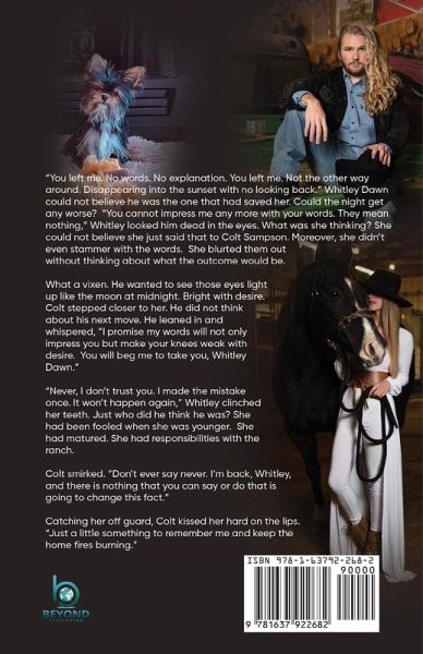 "You left me. No words. No explanation. You left me. Not the other way around. Disappearing into the sunset with no looking back." Whitley Dawn could not believe he was the one that had saved her. Could the night get any worse? "You cannot impress me any more with your words. They mean nothing," Whitley looked him dead in the eyes. What was she thinking? She could not believe she just said that to Colt Sampson. Moreover, she didn't even stammer with the words. She blurted them out without thinking about what the outcome would be.What a vixen. He wanted to see those eyes light up like the moon at midnight. Bright with desire. Colt stepped closer to her. He did not think about his next move. He leaned in and whispered, "I promise my words will not only impress you but make your knees weak with desire. You will beg me to take you, Whitley Dawn." "Never, I don't trust you. I made the mistake once. It won't happen again," Whitley clinched her teeth. Just who did he think he was? She had been fooled when she was younger. She had matured. She had responsibilities with the ranch. Colt smirked. "Don't ever say never. I'm back, Whitley, and there is nothing that you can say or do that is going to change this fact." Catching her off guard, Colt kissed her hard on the lips. "Just a little something to remember me and keep the home fires burning."