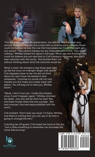 "You left me. No words. No explanation. You left me. Not the other way around. Disappearing into the sunset with no looking back." Whitley Dawn could not believe he was the one that had saved her. Could the night get any worse? "You cannot impress me any more with your words. They mean nothing," Whitley looked him dead in the eyes. What was she thinking? She could not believe she just said that to Colt Sampson. Moreover, she didn't even stammer with the words. She blurted them out without thinking about what the outcome would be.What a vixen. He wanted to see those eyes light up like the moon at midnight. Bright with desire. Colt stepped closer to her. He did not think about his next move. He leaned in and whispered, "I promise my words will not only impress you but make your knees weak with desire. You will beg me to take you, Whitley Dawn." "Never, I don't trust you. I made the mistake once. It won't happen again," Whitley clinched her teeth. Just who did he think he was? She had been fooled when she was younger. She had matured. She had responsibilities with the ranch. Colt smirked. "Don't ever say never. I'm back, Whitley, and there is nothing that you can say or do that is going to change this fact." Catching her off guard, Colt kissed her hard on the lips. "Just a little something to remember me and keep the home fires burning."