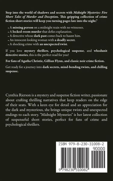 Step into the world of shadows and secrets with Midnight Mysteries: Five Short Tales of Murder and Deception. This gripping collection of crime fiction short stories will keep you turning pages late into the night."A missing person on a midnight train with no witnesses. A locked-room murder that defies explanation. A detective whose dark past comes back to haunt him. An innocent-looking woman with a deadly secret. A shocking crime with an unexpected twist. If you love mystery thrillers, psychological suspense, and whodunit detective stories, this is the perfect read for you! For fans of Agatha Christie, Gillian Flynn, and classic noir crime fiction. Get ready for a journey into dark secrets, mind-bending twists, and chilling suspense.