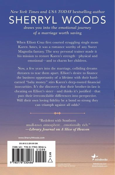 The Sweet Magnolias is now a Netflix Original Series! From #1 New York Times Bestselling Author Sherryl Woods When Elliott Cruz first courted struggling single mom Karen Ames, it was a romance worthy of any Sweet Magnolia fantasy. The sexy personal trainer made it his mission to restore Karen's strength?physical and emotional?and to charm her children. Now, a few years into the marriage, colliding dreams threaten to tear them apart. Elliott's desire to finance the business opportunity of a lifetime with their hard-earned ?baby money? stirs Karen's deep-rooted financial insecurities. It's the discovery that their brother-in-law is cheating on Elliott's sister?and thinks it's justified?that puts their irreconcilable differences into perspective. Will their own loving fidelity be a bond so strong they can triumph against all odds? Read the Sweet Magnolias Series by Sherryl Woods: Book One: Stealing Home Book Two: A Slice of Heaven Book Three: Feels Like Family Book Four: Welcome to Serenity Book Five: Home in Carolina Book Six: Sweet Tea at Sunrise Book Seven: Honeysuckle Summer Book Eight: Midnight Promises Book Nine: Catching Fireflies Book Ten: Where Azaleas Bloom Book Eleven: Swan Point Bonus: The Sweet Magnolias Cookbook