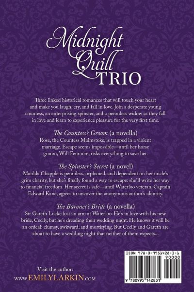Three linked historical romances that will touch your heart and make you laugh, cry, and fall in love... Join a desperate young countess, an enterprising spinster, and a penniless widow as they fall in love and learn to experience pleasure for the very first time. This trio of sensual and deeply emotional stories includes one daring rescue, one scandalous secret, one extremely awkward wedding night, one gentle giant, two battle-scarred officers, a darkly gothic manor house, and some of the worst food in England. The Midnight Quill Trio by award-winning and USA Today bestselling author Emily Larkin consists of two novellas and one full-length novel: The Countess's Groom, The Spinster's Secret, and The Baronet's Bride. If you love richly detailed historical romances brimming with passion, emotion, and compelling characters, then this collection is for you! Length: One novel and two novellas totaling 104,000 words Sensuality level: These historical romances contain steamy love scenes The Countess's Groom (a novella) Rose, the young Countess Malmstoke, is trapped in a violent marriage. Escape seems impossible-until her horse groom, Will Fenmore, steps forward to help her. The Spinster's Secret (a novel) Matilda Chapple is penniless, orphaned, and dependent on her uncle's grim charity, but she's finally found a way to escape: she'll write her way to financial freedom! Her secret is safe-until battle-scarred Waterloo veteran, Captain Edward Kane, agrees to uncover the anonymous author's identity. The Baronet's Bride (a novella) Sir Gareth Locke lost an arm at Waterloo. He's in love with his new bride, Cecily, but he's dreading their wedding night. He knows it will be an ordeal: clumsy, awkward, and mortifying. But Cecily and Gareth are about to have a wedding night that neither of them expects...