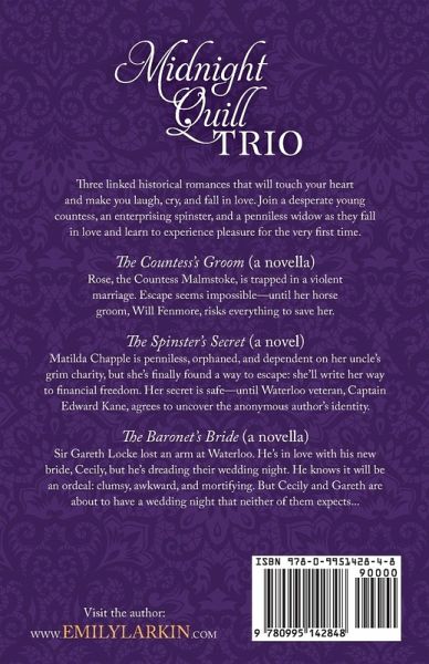 Three linked historical romances that will touch your heart and make you laugh, cry, and fall in love... Join a desperate young countess, an enterprising spinster, and a penniless widow as they fall in love and learn to experience pleasure for the very first time. This trio of sensual and deeply emotional stories includes one daring rescue, one scandalous secret, one extremely awkward wedding night, one gentle giant, two battle-scarred officers, a darkly gothic manor house, and some of the worst food in England. The Midnight Quill Trio by award-winning and USA Today bestselling author Emily Larkin consists of two novellas and one full-length novel: The Countess's Groom, The Spinster's Secret, and The Baronet's Bride. If you love richly detailed historical romances brimming with passion, emotion, and compelling characters, then this collection is for you! Length: One novel and two novellas totaling 104,000 words Sensuality level: These historical romances contain steamy love scenes The Countess's Groom (a novella) Rose, the young Countess Malmstoke, is trapped in a violent marriage. Escape seems impossible-until her horse groom, Will Fenmore, steps forward to help her. The Spinster's Secret (a novel) Matilda Chapple is penniless, orphaned, and dependent on her uncle's grim charity, but she's finally found a way to escape: she'll write her way to financial freedom! Her secret is safe-until battle-scarred Waterloo veteran, Captain Edward Kane, agrees to uncover the anonymous author's identity. The Baronet's Bride (a novella) Sir Gareth Locke lost an arm at Waterloo. He's in love with his new bride, Cecily, but he's dreading their wedding night. He knows it will be an ordeal: clumsy, awkward, and mortifying. But Cecily and Gareth are about to have a wedding night that neither of them expects...