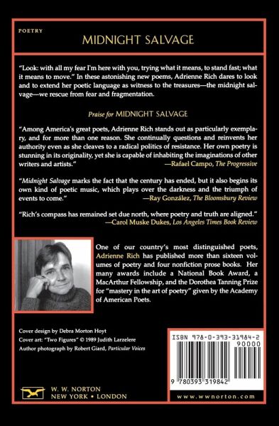 "Look: with all my fear I'm here with you, trying what it means, to stand fast; what it means to move." In these astonishing new poems, Adrienne Rich dares to look and to extend her poetic language as witness to the treasures-the midnight salvage-we rescue from fear and fragmentation. Rich's work has long challenged social plausibilities built on violence and demoralizing power. In Midnight Salvage, she continues her explorations at the end of the century, trying, as she has said, "to face the terrible with hope, in language as complex as necessary, as communicative as possible-a poetics which can work as antidote to complacency, self-involvement, and despair. I have wanted to assume a theater of voices rather than the restricted I. To write for both readers I know exist and those I can only imagine, finding their own salvaged beauty as I have found mine." "In her vision of warning and her celebration of life, Adrienne Rich is the Blake of American letters."-Nadine Gordimer