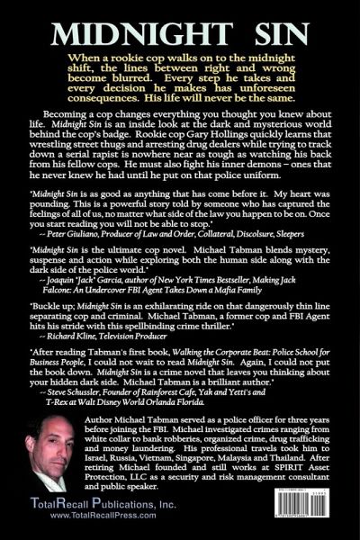 MIDNIGHT SIN When a rookie cop walks on to the midnight shift, the lines between right and wrong become blurred. Every step he takes and every decision he makes has unforeseen consequences. His life will never be the same. Becoming a cop changes everything you thought you knew about life. Midnight Sin is an inside look at the dark and mysterious world behind the cop's badge. Rookie cop Gary Hollings quickly learns that wrestling street thugs and arresting drug dealers while trying to track down a serial rapist is nowhere near as tough as watching his back from his fellow cops. He must also fight his inner demons - ones that he never knew he had until he put on that police uniform. The police world is one of long hours and split-second decisions where the choices are not always clear. Midnight Sin is a gritty cop novel that explores the complexities of the cop psyche. "I have spent my life watching cop shows both on TV and in the movies and Michael Tabman's Midnight Sin is as good as anything that has come before it. Once you start reading you will not be able to stop. Michael has reached deep inside and managed to capture his heart and soul as a cop - the joy of helping others as well as the fear and loathing felt so deeply as they are forced to deal with the worst our society has to offer. My heart was pounding. This is a powerful story told by someone who has captured the feelings of all of us, no matter which side of the law you happen to be on." -- Peter Giuliano, Producer of Law and Order, Collateral, Disclosure, Sleepers "Midnight Sin is the ultimate cop novel. Michael Tabman blends mystery, suspense and action while exploring both the human side along with the dark side of the police world." -- Joaquin "Jack" Garcia, author of New York Times Bestseller, Making Jack Falcone: An Undercover FBI Agent Takes Down a Mafia Family "Buckle up; Midnight Sin is an exhilarating ride on that dangerously thin line separating cop and criminal. Michael Tabman, a former cop and FBI Agent hits his stride with this spellbinding crime thriller." -- Richard Kline, Television Producer "After reading Tabman's first book, Walking the Corporate Beat: Police School for Business People, I could not wait to read Midnight Sin. Again, I could not put the book down. Midnight Sin is a crime novel that leaves you thinking about your hidden dark side." -- Steve Schussler, Founder of Rainforest Cafe, Yak and Yetti's and T-Rex at Walt Disney World, Orlando, Florida. Author Michael Tabman was born and raised in New York City. He graduated from John Jay College of Criminal Justice in Manhattan, NY. After serving as a police officer for three years with the Fairfax County VA police department he joined the FBI. Michael, A 24 year FBI veteran, investigated crimes ranging from white collar to bank robberies, organized crime, drug trafficking and money laundering. He rose through the ranks reaching the level of Special Agent in Charge. His professional travels took him to Israel, Russia, Vietnam, Singapore, Malaysia and Thailand. After retiring, Michael founded and still works at SPIRIT Asset Protection, LLC as a security and risk management consultant and public speaker. Michael's first book Walking the Corporate Beat: Police School for Business People, is based upon his 27 years of law enforcement experience to draw amusing parallels between the police world, business world and everyday life decisions.