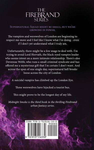 Supernatural Squad might be small, but we're growing in power. The vampires and werewolves of London are beginning to respect me more and I feel like I know what I'm doing - even if I don't yet understand what I truly am. Unfortunately, there might be a few snags to deal with. I'm trying to avoid Lord Horvath, the black-eyed vampire leader who seems intent on a more intimate relationship. There's also Devereau Webb, who runs a small criminal syndicate and has offered me a mysterious gift that I'm certain I don't want. And across the span of one single day, supernatural hell breaks loose across the city of London. A suicidal vampire has climbed up the London Eye. Three werewolves have hijacked a tourist bus. This might prove to be the longest day of my life. Midnight Smoke is the third book in the thrilling Firebrand urban fantasy series.