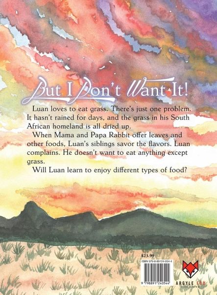 Luan loves to eat grass. There's just one problem. It hasn't rained for days, and the grass in his South African homeland is all dried up. When Mama and Papa Rabbit offer leaves and other foods, Luan's siblings savor the flavors. Luan complains. He doesn't want to eat anything except grass. Will Luan learn to enjoy different types of food?