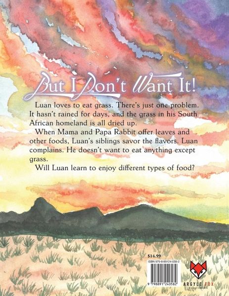 Luan loves to eat grass. There's just one problem. It hasn't rained for days, and the grass in his South African homeland is all dried up. When Mama and Papa Rabbit offer leaves and other foods, Luan's siblings savor the flavors. Luan complains. He doesn't want to eat anything except grass. Will Luan learn to enjoy different types of food?