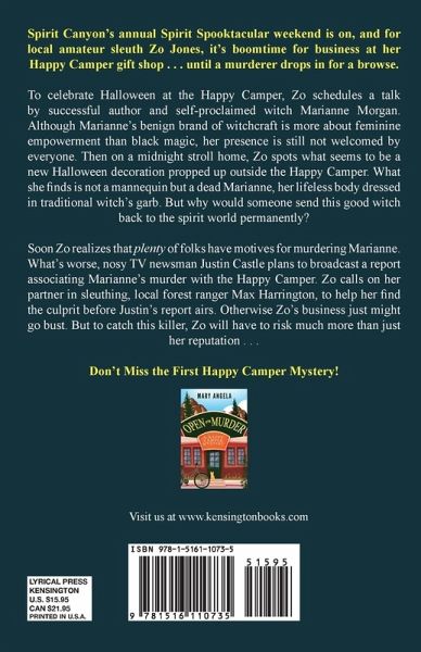 Spirit Canyon’s annual Spirit Spooktacular weekend is on, and for local amateur sleuth Zo Jones, it’s boomtime for business at her Happy Camper gift shop . . . until a murderer drops in for a browse. To celebrate Halloween at the Happy Camper, Zo schedules a talk by successful author and self-proclaimed witch Marianne Morgan. Although Marianne’s benign brand of witchcraft is more about feminine empowerment than black magic, her presence is still not welcomed by everyone. Then on a midnight stroll home, Zo spots what seems to be a new Halloween decoration propped up outside the Happy Camper. What she finds is not a mannequin but a dead Marianne, her lifeless body dressed in traditional witch’s garb. But why would someone send this good witch back to the spirit world permanently? Soon Zo realizes that plenty of folks have motives for murdering Marianne. What’s worse, nosy TV newsman Justin Castle plans to broadcast a report associating Marianne’s murder with the Happy Camper. Zo calls on her partner in sleuthing, local forest ranger Max Harrington, to help her find the culprit before Justin’s report airs. Otherwise Zo’s business just might go bust. But to catch this killer, Zo will have to risk much more than just her reputation . . .