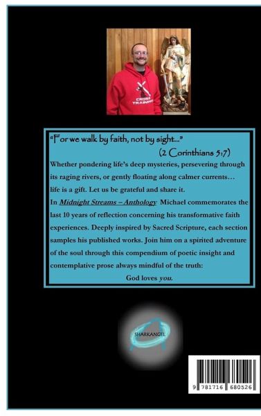 "For we walk by faith, not by sight..." Whether pondering life's deep mysteries, persevering through its raging rivers, or gently floating along calmer currents... life is a gift. Let us be grateful and share it. In Midnight Streams - Anthology Michael commemorates the last 10 years of reflection concerning his transformative faith experiences. Deeply inspired by Sacred Scripture, each section samples his published works. Join him on a spirited adventure of the soul through this compendium of poetic insight and contemplative prose always mindful of the truth: God loves you.