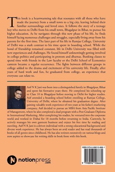 This book is a heartwarming tale that resonates with all those who have made the journey from a small town to a big city, leaving behind their familiar surroundings and loved ones. It follows the story of a teenage boy who moves to Delhi from his small town, Bhagalpur in Bihar, to pursue his higher education. As he navigates through this new phase of his life, he finds himself facing numerous challenges and struggles, especially living away from his parents for the first time. The later part of his life in Ramjas College, University of Delhi was a stark contrast to his time spent in boarding school. While the bond of friendship remained constant, life in Delhi University was filled with new experiences and challenges. He found himself unknowingly getting involved in college politics and participating in protests and dharnas. Bunking classes to spend time with friends in the Law faculty or the Delhi School of Economics canteen became a regular occurrence. The fights between different groups in college added to the drama and excitement of his university life. Finally, after years of hard work and fun, he graduated from college, an experience that everyone can relate