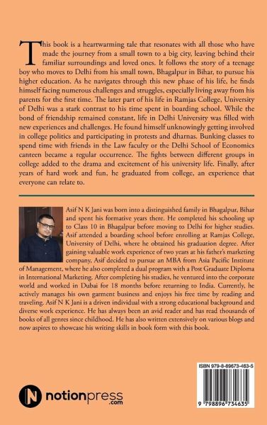 This book is a heartwarming tale that resonates with all those who have made the journey from a small town to a big city, leaving behind their familiar surroundings and loved ones. It follows the story of a teenage boy who moves to Delhi from his small town, Bhagalpur in Bihar, to pursue his higher education. As he navigates through this new phase of his life, he finds himself facing numerous challenges and struggles, especially living away from his parents for the first time. The later part of his life in Ramjas College, University of Delhi was a stark contrast to his time spent in boarding school. While the bond of friendship remained constant, life in Delhi University was filled with new experiences and challenges. He found himself unknowingly getting involved in college politics and participating in protests and dharnas. Bunking classes to spend time with friends in the Law faculty or the Delhi School of Economics canteen became a regular occurrence. The fights between different groups in college added to the drama and excitement of his university life. Finally, after years of hard work and fun, he graduated from college, an experience that everyone can relate