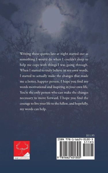 Writing these quotes late at night started out as something I would do when I couldn't sleep to help me cope with things I was going through. When I started to truly believe in my own words, I started to actually make the changes that made me a better, happier person. I hope you find my words motivational and inspiring in your own life. You're the only person who can make the changes necessary to move forward. I hope you find the courage to live your life to the fullest, and hopefully, my words can help.