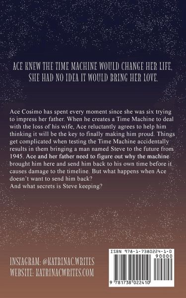 Ace knew the time machine would change her life, she had no idea it would bring her love. Ace Cosimo has spent every moment since she was six trying to impress her father. When he creates a Time Machine to deal with the loss of his wife, Ace reluctantly agrees to help him thinking it will be the key to finally making him proud. Things get complicated when testing the Time Machine accidentally results in them bringing a man named Steve to the future from 1945. Ace and her father need to figure out why the machine brought him here and send him back to his own time before it causes damage to the timeline. But what happens when Ace doesn't want to send him back? And what secrets is Steve keeping?