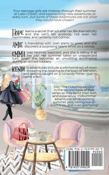 Four teenage girls are midway through their summer at Lake Chelan and experiencing new adventures at every turn...but some of these adventures are not what they would have chosen! Hope learns a secret that will alter her life dramatically and she can't tell anybody, not even her roommates, and certainly not Conner. Amie's friendship with her older co-worker, Josh, starts to grow, and she discovers a surprising talent while on a retreat. Emma was recently baptized, and she is killing it at her job! What could go wrong? Her summer takes an unexpected turn when she becomes an unwitting accomplice during an armed robbery! Kendi's adventures include a whirlwind out-of-town shopping trip, boating to the town of Stehekin, and getting caught on a runaway horse-just to name a few! Join "The Guesthouse Girls" in the second book of their series as they build their faith and experience midsummer adventures while working summer jobs, taking out-of-town trips, and even glamping! Fun coming-of-age beach read!