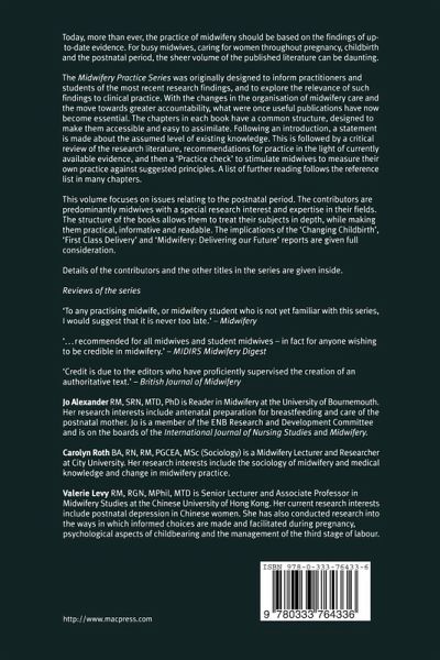 The latest volume in this series revisits topics particularly pertinent to the postnatal period. It makes a timely contribution to the literature in the context of recent developments in the organisation of midwifery care, the emphasis on woman-centred care and empowerment, and the reclaiming by midwives of the normal birth and puerperium.