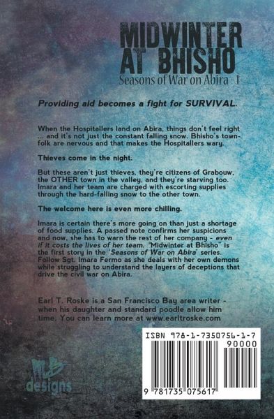 Providing aid becomes a fight for survival. When Imara lands on Abira with the rest of her company, things don't feel right. And it's not just the constant, falling snow. Bhisho's townsfolk are nervous. This makes the Hospitallers wary. Then, thieves come in the night. But the thieves aren't just thieves, they're citizens of Grabouw, the other town in the valley. The Hospitallers learn that the people of Grabouw are starving, too. Imara and her team are charged with escorting supplies, through the snow, to the other town. The welcome here is even more chilling. Imara is certain more is going on than just a shortage of food supplies. A passed note confirms her suspicions. Now, Imara not only has to get her team safely back to Bhisho, but she also needs to report the truth, even if it costs her teams' lives. Midwinter on Bhisho is the first story in the Seasons of War on Abira series. Follow Sgt Imara Fermo as she not only deals with her own demons but also struggles to understand the layers of deceptions that drive the civil war on Abira. Get the book. Get reading. The adventure awaits.