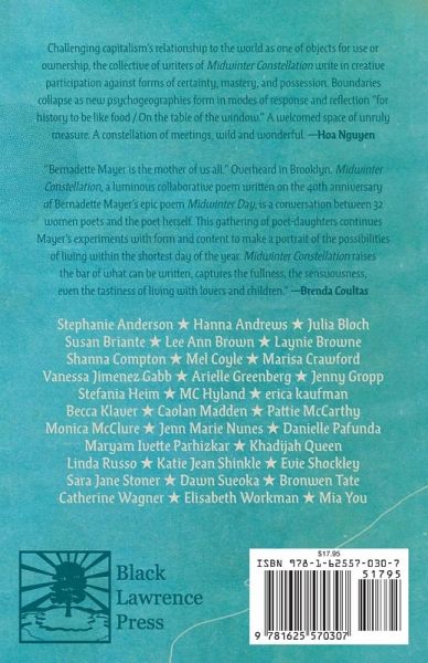 On December 22, 2018, the 40th anniversary of Bernadette Mayer's writing of Midwinter Day, 32 women poets typed into Google Docs titled Dreams, Morning, Noontime, Afternoon, Evening, and Night. Following the six-part structure of Mayer's book, they composed alongside each other all day, dozens of cursors blinking in a virtual happening. MIDWINTER CONSTELLATION is the result. Part patchwork quilt, part collective consciousness, the book hopes "to prove the day like the dream has everything in it," as Mayer wrote in 1978, and to extend her vision into a global 21st-century everyday. A radical experiment in collective writing, the book embroiders, echoes, and blurs the voices of poets across the U.S. and beyond. They wake up in bed together and spend the day writing while nursing babies, grading papers, driving home for the holidays, making meals, and gathering in bookstores and living rooms to read Midwinter Day aloud. While threads of identity can be traced through the repeated names of children, highways, books, and pets, MIDWINTER CONSTELLATION declines to identify who's speaking when, exceeding the territory of authorship and rejecting the illusion that we are separate. MIDWINTER CONSTELLATION was written by Stephanie Anderson, Hanna Andrews, Julia Bloch, Susan Briante, Lee Ann Brown, Laynie Browne, Shanna Compton, Mel Coyle, Marisa Crawford, Vanessa Jimenez Gabb, Arielle Greenberg, Jenny Gropp, Stefania Heim, MC Hyland, erica kaufman, Becca Klaver, Caolan Madden, Pattie McCarthy, Monica McClure, Jenn Marie Nunes, Danielle Pafunda, Maryam Ivette Parhizkar, Khadijah Queen, Linda Russo, Katie Jean Shinkle, Evie Shockley, Sara Jane Stoner, Dawn Sueoka, Bronwen Tate, Catherine Wagner, Elisabeth Workman, and Mia You.